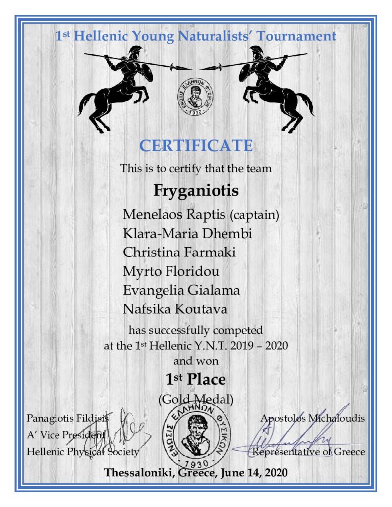 Χρυσό Μετάλλιο στο Πανελλήνιο Πρωτάθλημα «Hellenic Young Naturalists’ Tournament 2020» και συμμετοχή στους Διεθνείς Τελικούς Αγώνες «ΙΥΝΤ 2020» στη Ρωσία.